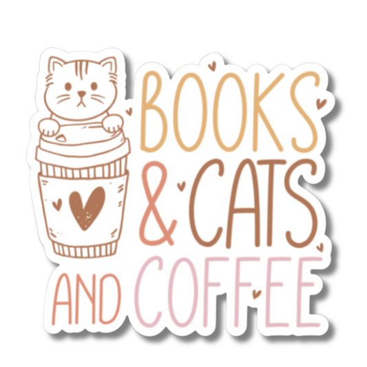 Books Cats & Coffee Laminated Sticker Decal for Laptops Phones | Book Lover | Cat Lover | Sticker Collector