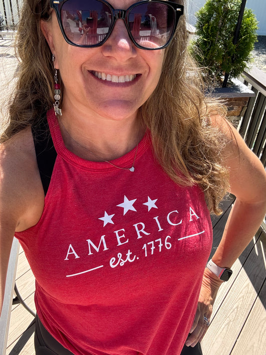 America est. 1776 Patriotic Tank Top – Red Halter Neck – Memorial Day, 4th of July Shirt, USA Graphic Rocker Style