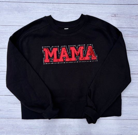 MAMA Black Cropped Crewneck Sweatshirt – Rhinestone & Varsity Lettering