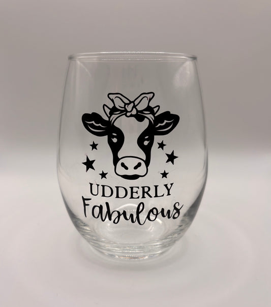 Udderly Fabulous Stemless Wine Glass | Pretty Cow with Bow | 15 oz